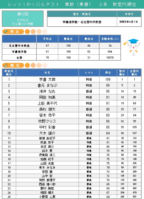 塾内順位は成績表に表示したくないのですが、可能ですか?